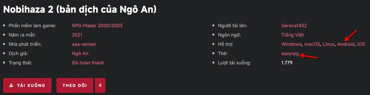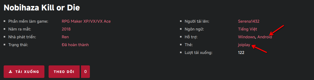 Trọng khi đang xem một thông tin game, hãy kiểm tra xem game đó có ghi Android trong mục Hỗ trợ không, và trong mục Thẻ có joiplay hay easyrpg không.