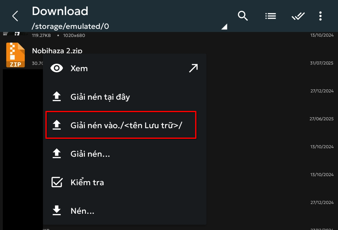 - Nhấn vào Giải nén vào ./tên lưu trữ/ (mục thứ 3).