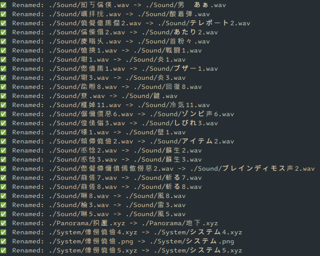 - If the script prints the word Renamed with the original name, it means you have found the correct encoding format, and the script has successfully renamed the file back to normal Japanese. If the script does not print any lines (or displays a Failed to rename error), you need to recheck the encoding format.